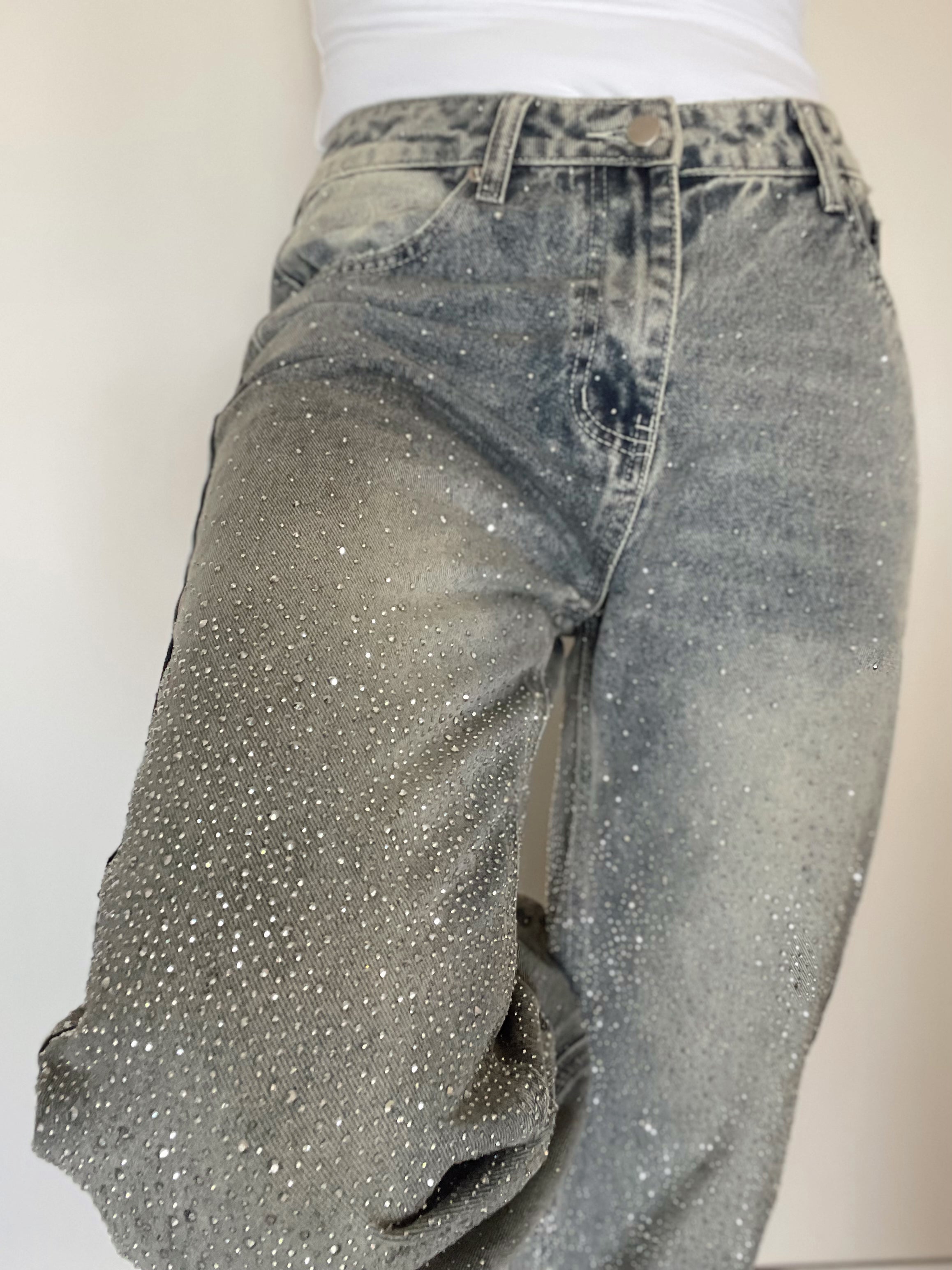 Un jean pensado para destacar. Este modelo de línea italiana combina la estructura clásica del denim rígido con un diseño moderno lleno de brillo que capta la luz en cada movimiento. Su tono óxido beige —una mezcla sofisticada entre beige y tonos tierra— lo convierte en una prenda diferente, elegante y fácil de combinar para looks nocturnos o outfits con personalidad.