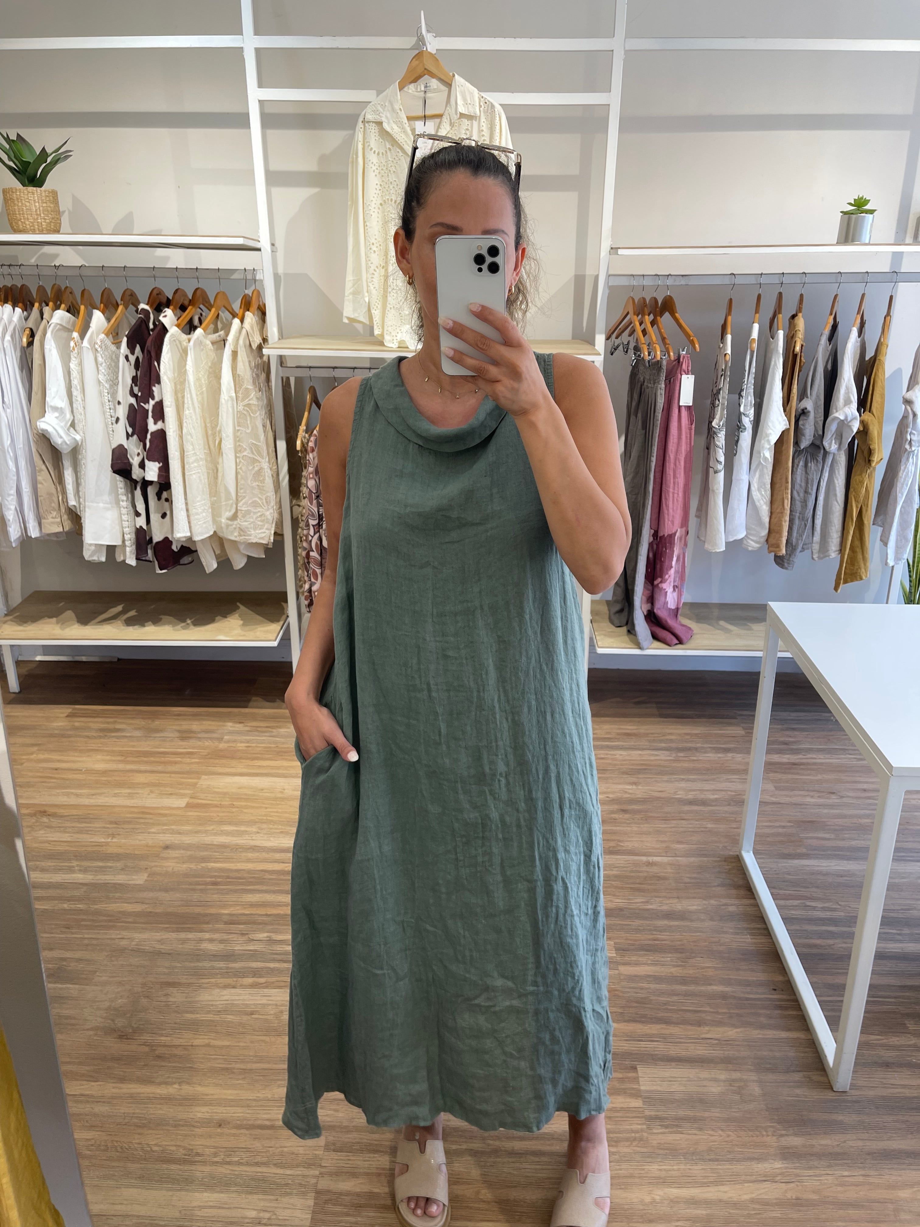 Vestido 100% lino con cuello buche. Talle único se adapta a S M L aprox. Chequear medidas