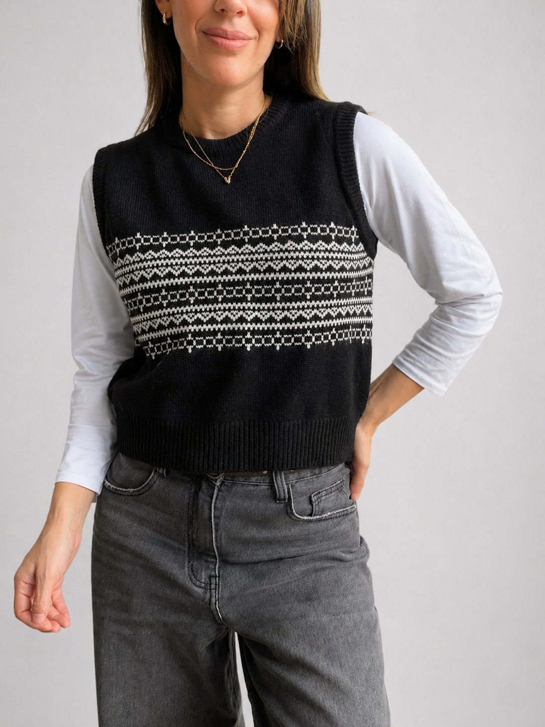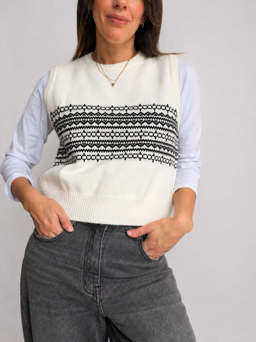 Chaleco tejido estilo Bariloche, un básico con personalidad que eleva cualquier look. Su diseño clásico en contraste lo hace súper combinable y perfecto para usar en capas.