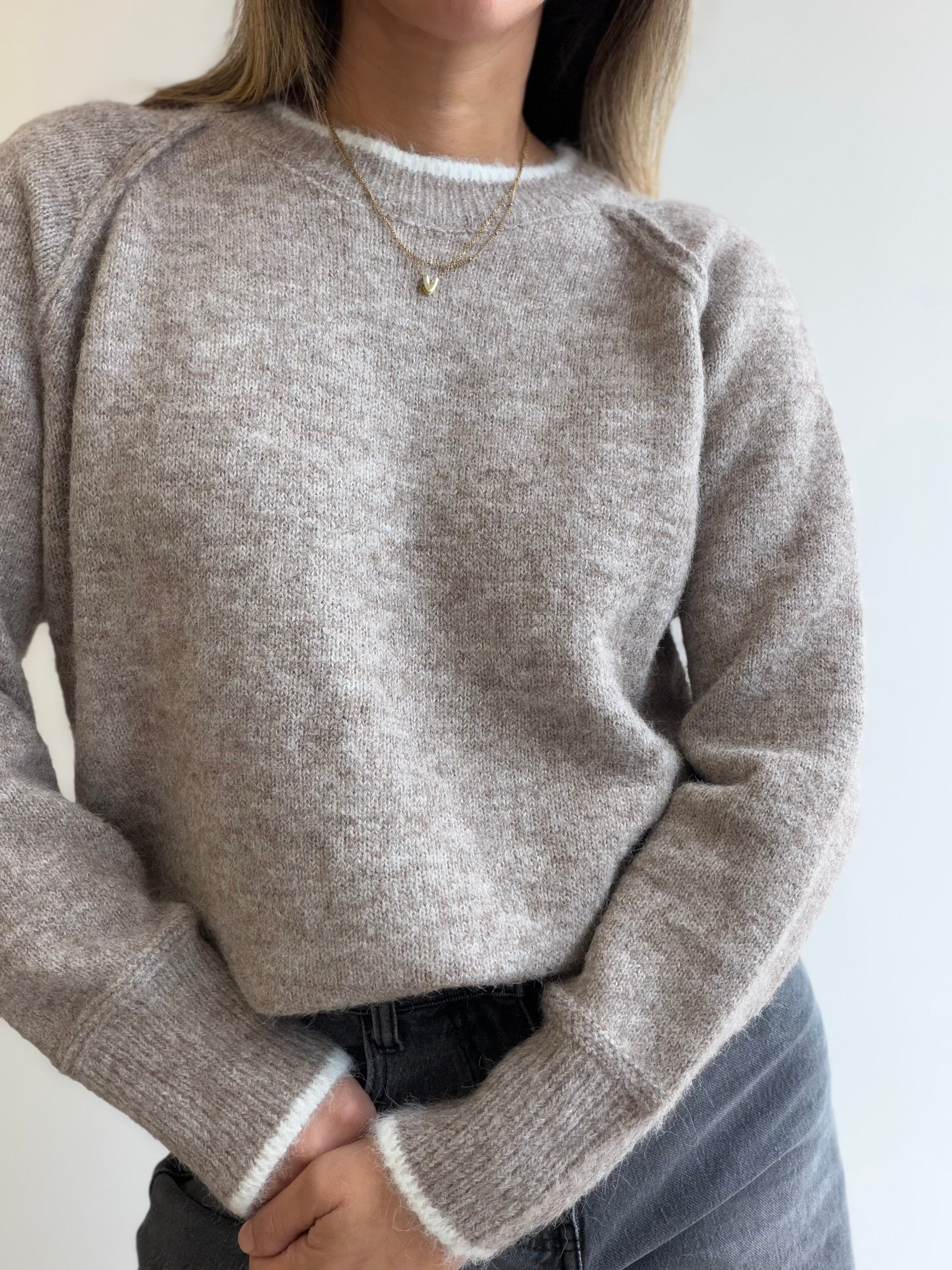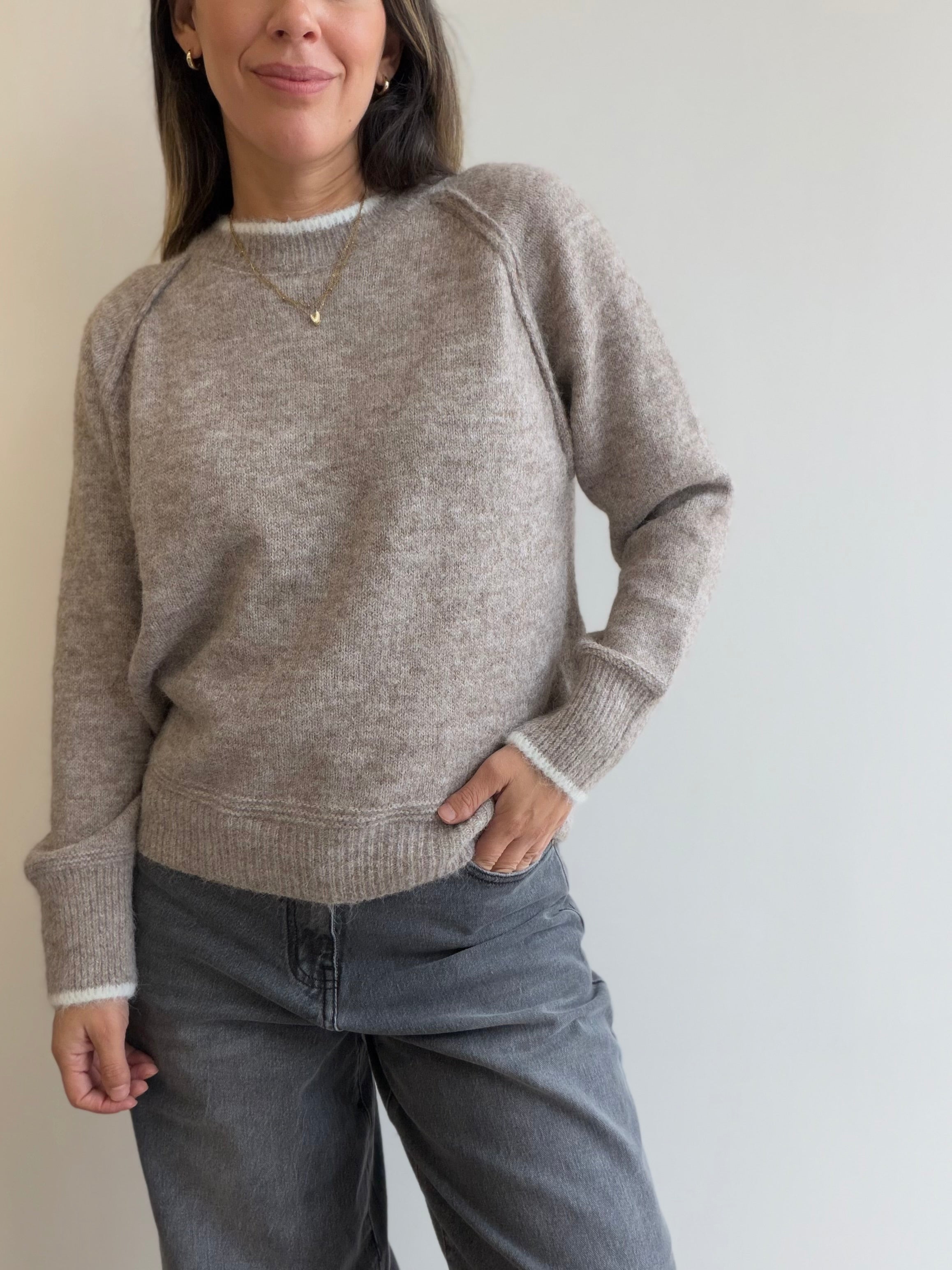 Suéter tejido suave con detalle bicolor en cuello y puños que le aporta un toque sutil y elegante al clásico tejido básico. Su textura es ligera y agradable al tacto, ideal para usar todos los días o combinar con jeans y pantalones más formales.