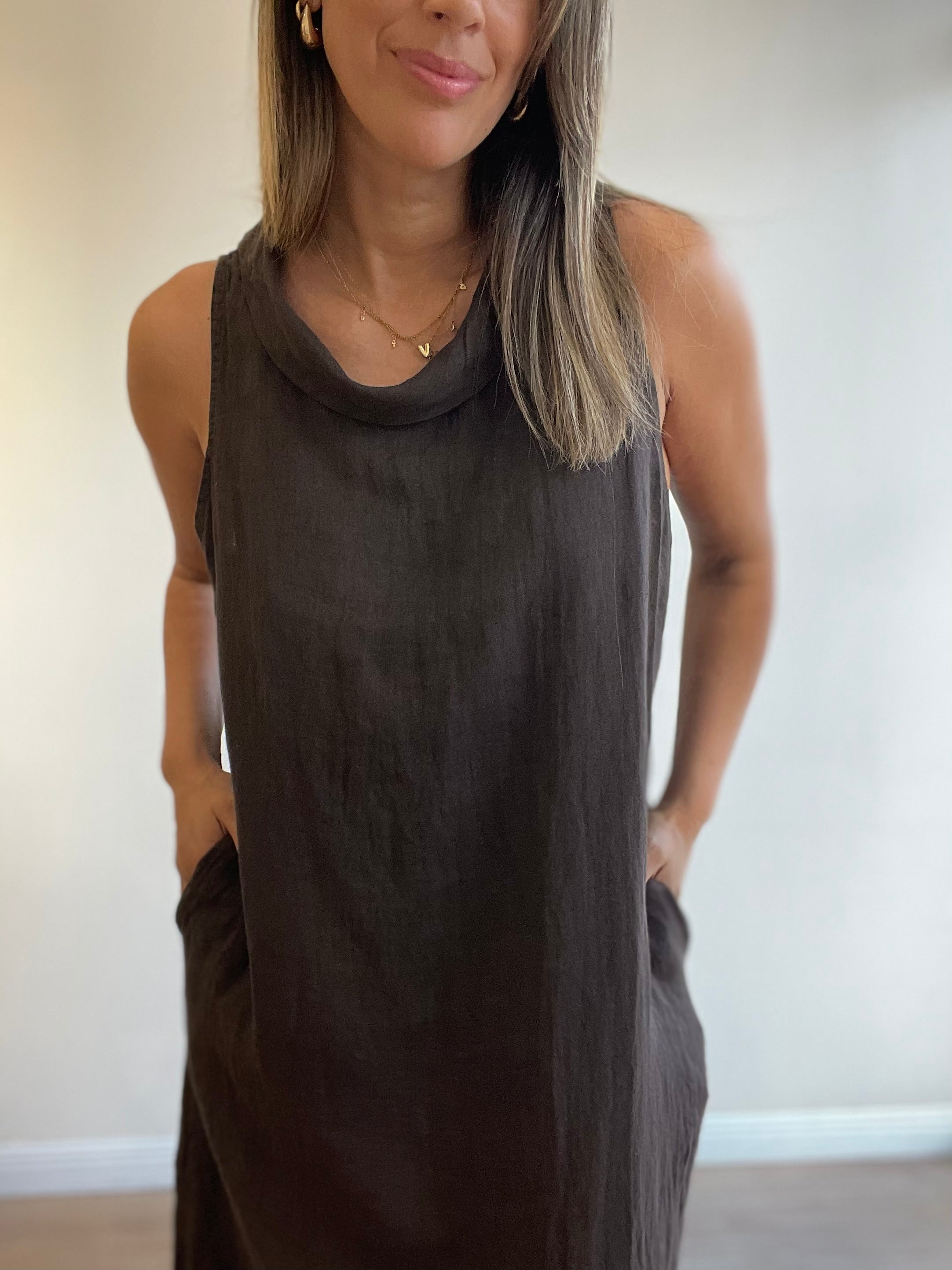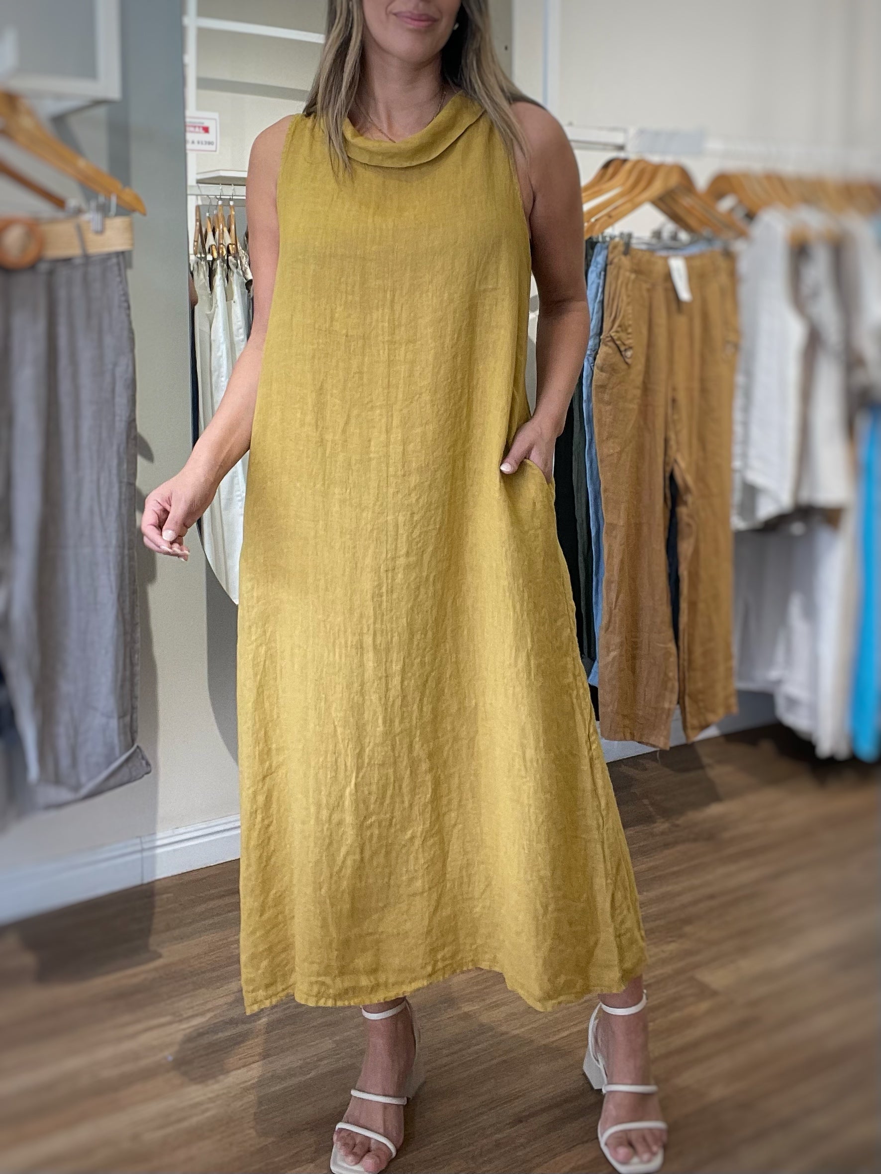 Vestido 100% lino con cuello buche. Talle único se adapta a S M L aprox. Chequear medidas