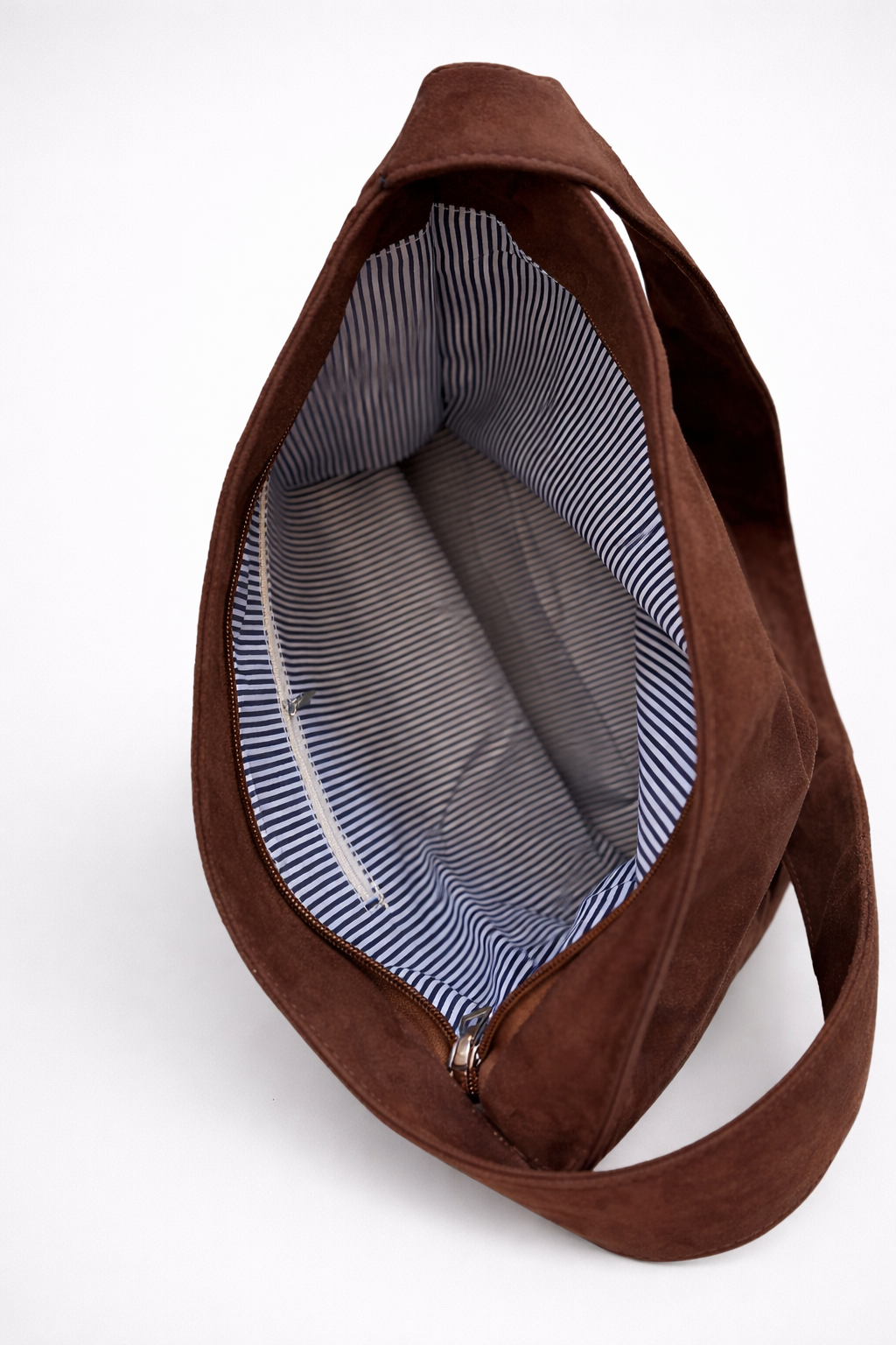 Bolso en color chocolate con acabado efecto gamuza, suave y elegante, perfecto para sumarte a la tendencia de la temporada. De tamaño mediano a grande, ideal para llevar todo lo que necesitás en tu día a día.