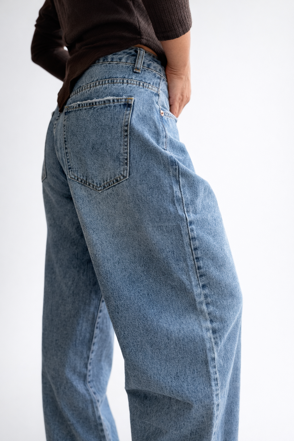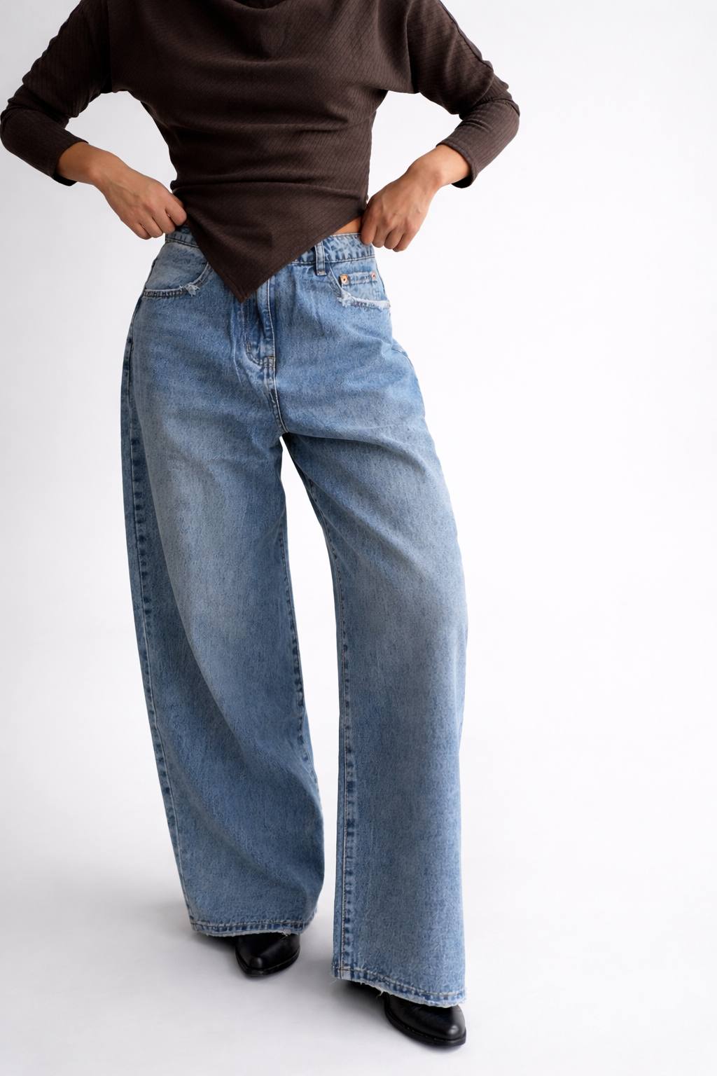 Jeans palazzo en tono celeste medio de la línea italiana, colección otoño-invierno. Su corte amplio y cómodo estiliza la silueta, mientras que los sutiles detalles de rotura en bolsillos y ruedo le aportan un toque canchero y actual.