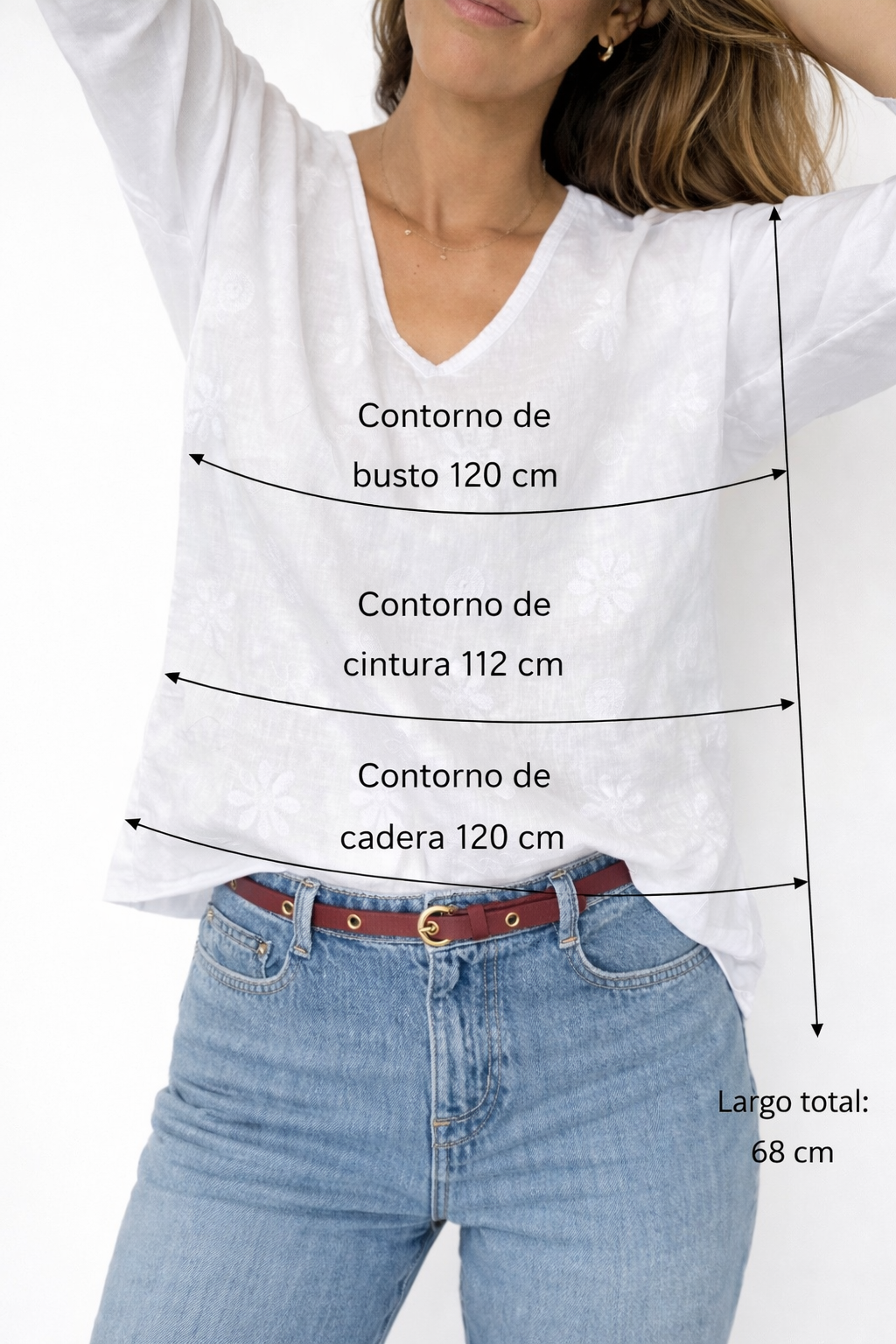 En la parte frontal presenta pequeñas florcitas y figuras con efecto bordado, que aportan textura y un detalle sutil al diseño. Su escote en V realza la silueta de manera delicada, manteniendo un equilibrio perfecto entre lo clásico y lo femenino.