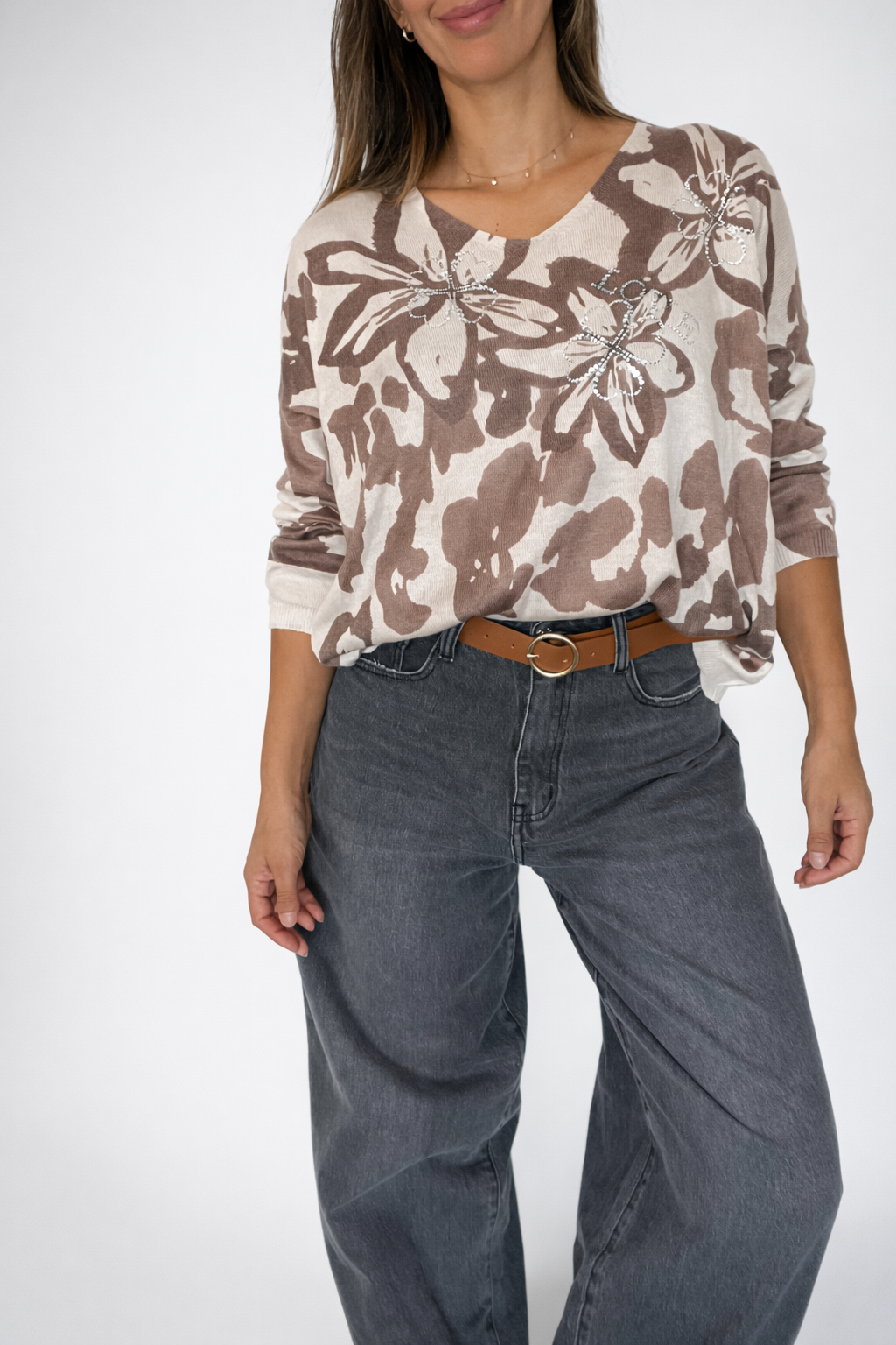 Presenta una estampa floral tipo print, combinada armónicamente con aplicaciones de strass que forman delicados motivos de tréboles y la palabra “LOVE”, aportando un toque femenino, sofisticado y distintivo.